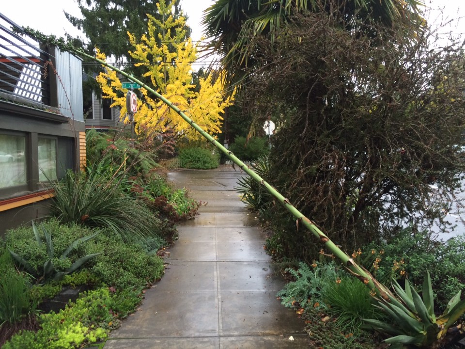 Here, Sharkey’s 20’4″ lays across the sidewalk against our railing.