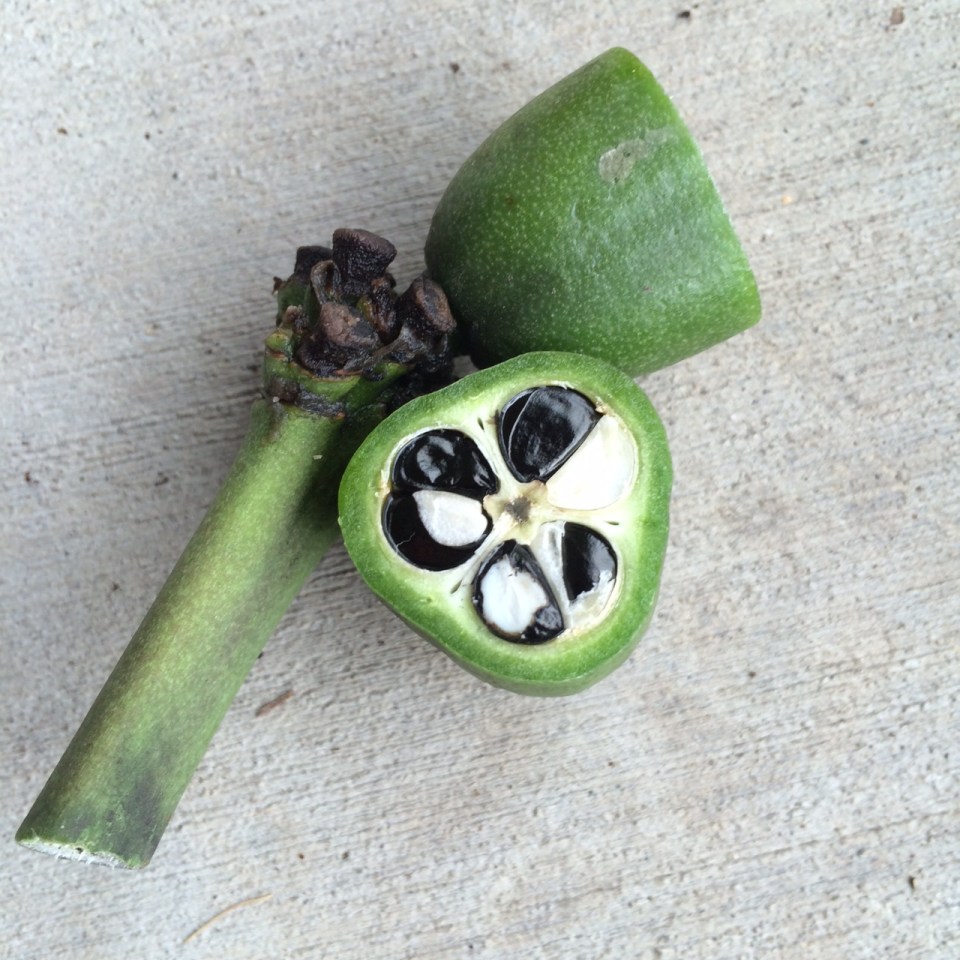 Cross-sectioning this ovary show the three chambers with the thicker membrane dividing them and a thinner membrane dividing the double row of seeds in each. Two of the black seeds show white endosperm within them as a result of my sectioning them with a knife. The other white ‘seed’ toward the upper right is an unfertilized one.