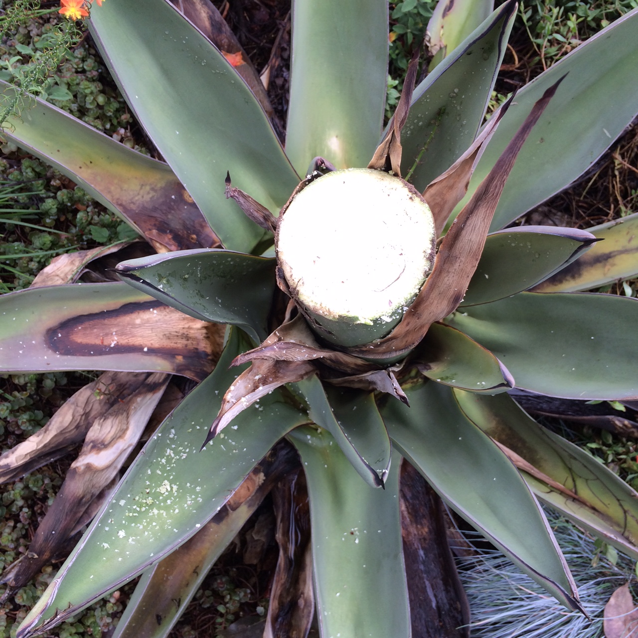 This photo of a cross section of the peduncle, is somewhat obscured as I made the cut with a saw after the whole thing toppled in the Fall. Looking more closely though shows a uniformity across it which suggests something about the rapidity of its growth as the meristem simply and quickly laid down one cell after the other in long fibers, vessels and trachea if a ground of parenchyma cells. There are no telltale rings or recognizable bodies, just a uniform ground.