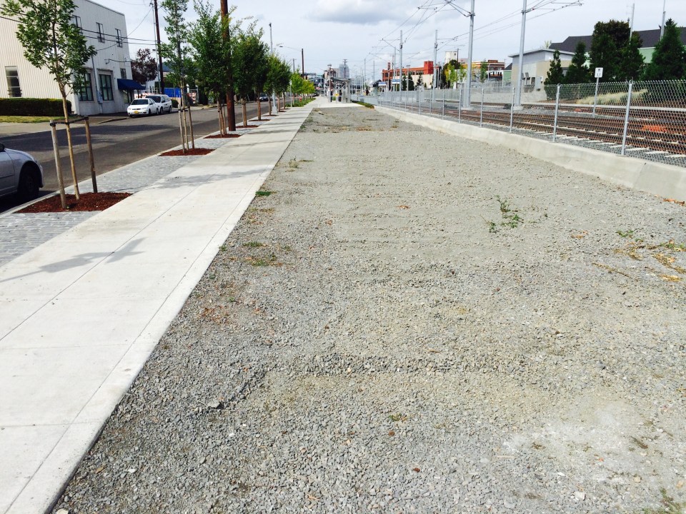The gravel ‘landscape’ in this photo is a curiosity to me….Why is it here? Currently maintenance does not utilize either pre-emergent herbicides on it or post, both of which are allowed on such sites. At over 200’ long this is a substantial area…for what purpose. It would appear to be an area sacrificed to the budget axe, left unplanted without any irrigation without any thought given to future maintenance. Next year it will look as if it has always been a weedy mess as the problem escalates and its burden of weed seed increases exponentially.