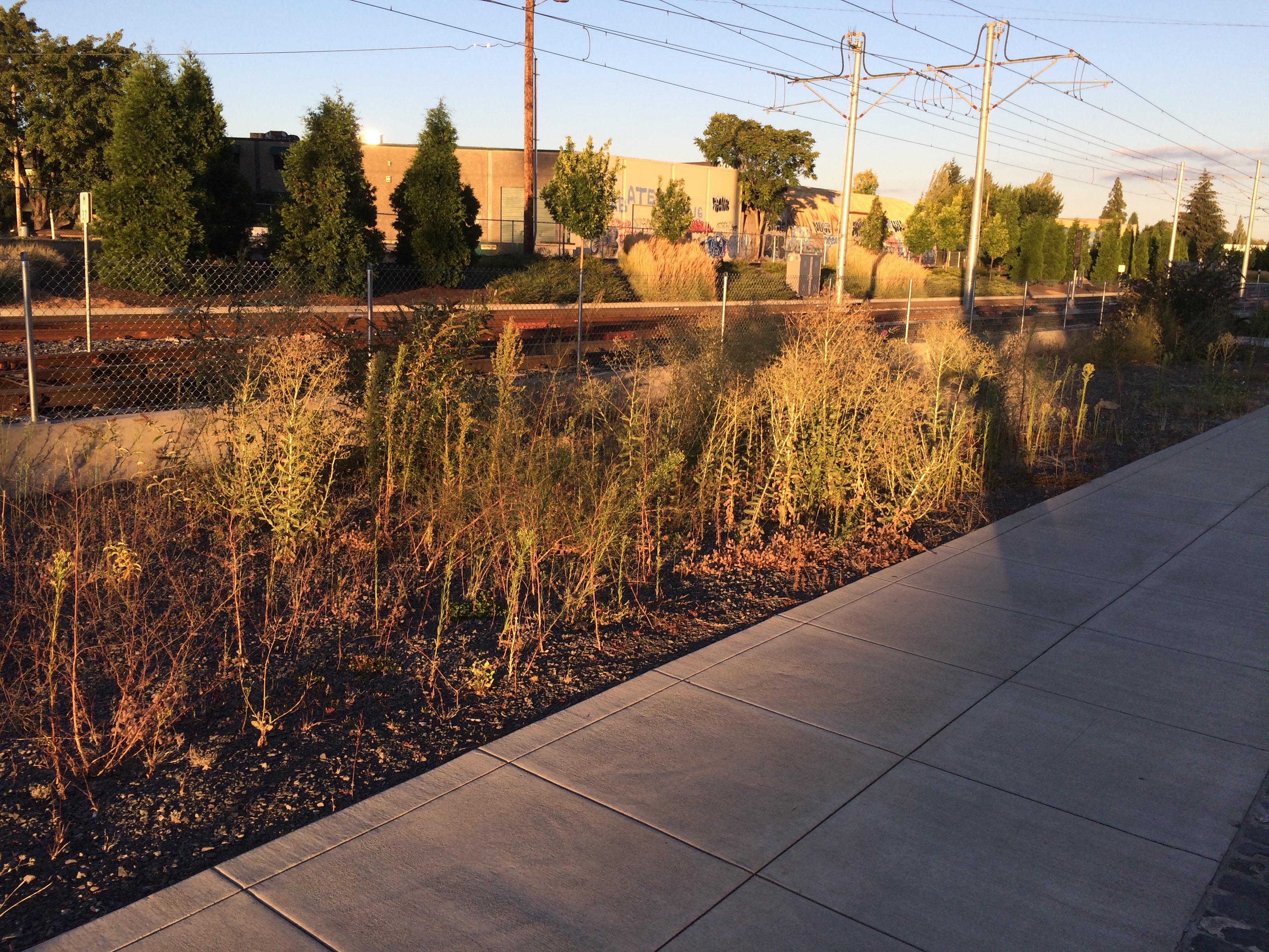 Across the fence to the left are both Tri-Met’s and the railroad’s tracks and their clean gravel bed, clean because such spaces are typically treated with powerful and effective soil sterilants, sometimes called bare soil herbicides. These kill both pre-existing plants and prevent the germination and establishment of new plants, for periods up to 10 years, depending upon the soil and weather conditions, longer in drier climates, less in wetter. Federal law, through FIFRA, specifically denies their use in landscapes, typically residential, commercial, institutional and Parks, reserving their use to rights-of-way and certain utilities uses. They are as effective on desirable plants as they are on weeds and they are often water soluble, meaning that water can move them through the soil, carrying them potentially into the ground water or to adjacent landscapes. They are a huge labor savings for the railroads as I’ve pointed out in earlier postings.