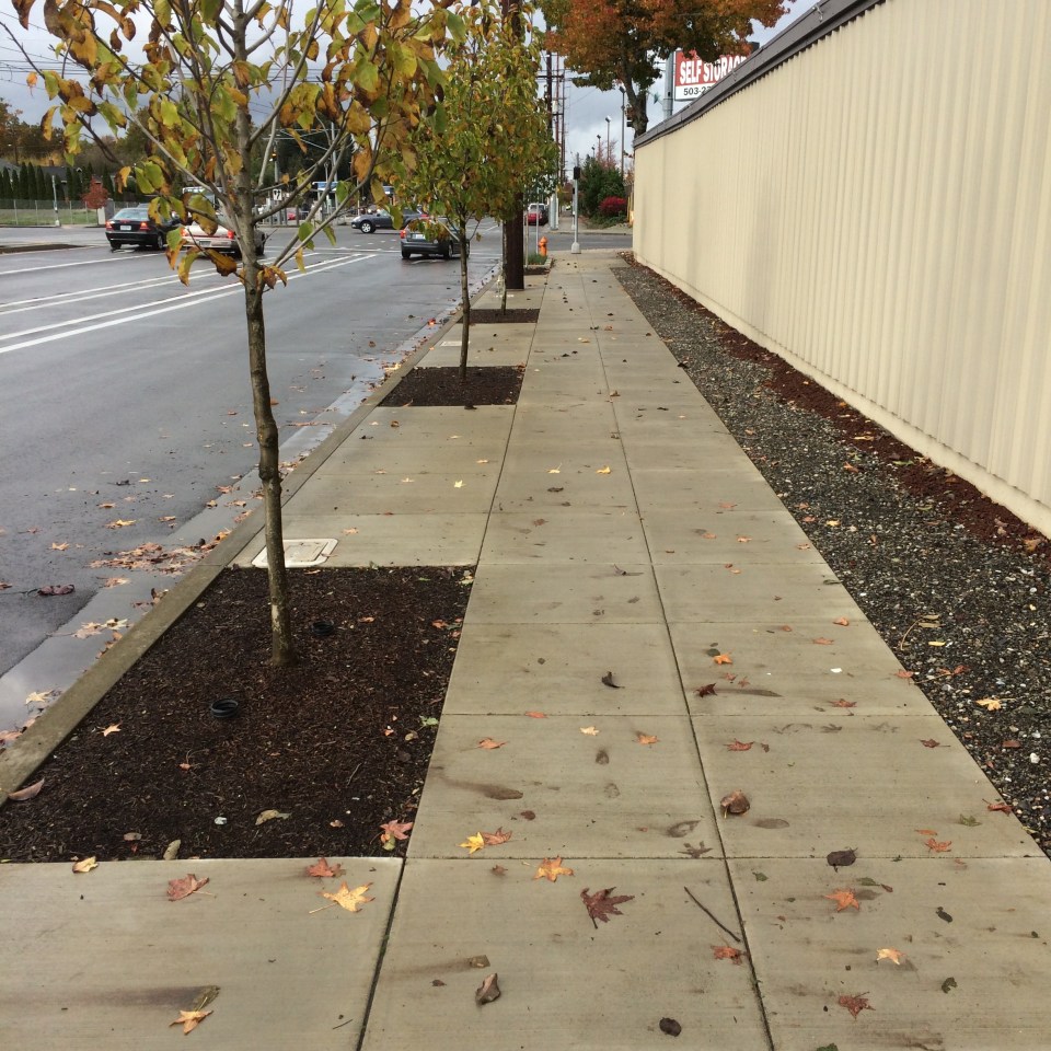 I came by this property a few weeks earlier and a woman was working to remove all of the weeds, which were immature and relatively small, from the gravel mulch at the base of the wall, which extends around the corner, and belongs to a storage company. The tree wells along the curb are part of the Tri-Met project and are clean as well, due to here diligence? likely. In any event her dutiful efforts benefit nearby properties by reducing the weed seed load. Interestingly much of the property on the west side of 17th here, stretching from just north of Holgate almost to Mcloughlin, is owned by private investors or Tri-Met and is awaiting redevelopment having had structures demolished and cleared and is being held in an increasingly weedy state. This is no doubt a factor in Tri-Mets adjacent and median finished landscapes.
