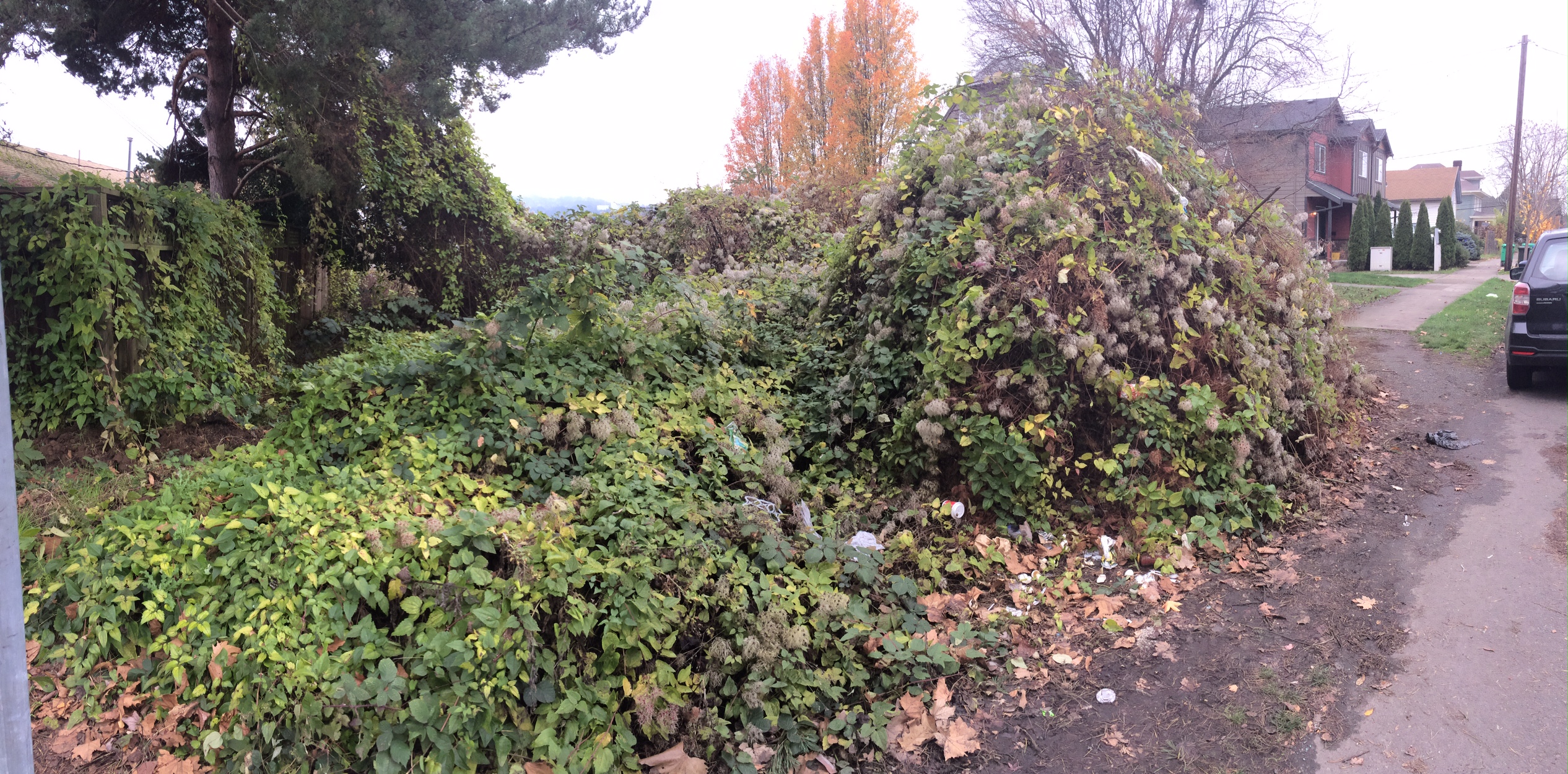 img_7299 ← Previous Next → This broad view looks northwesterly…most everything is buried beneath Clematis vitalba including the neighbors fence and landscaping to the left.