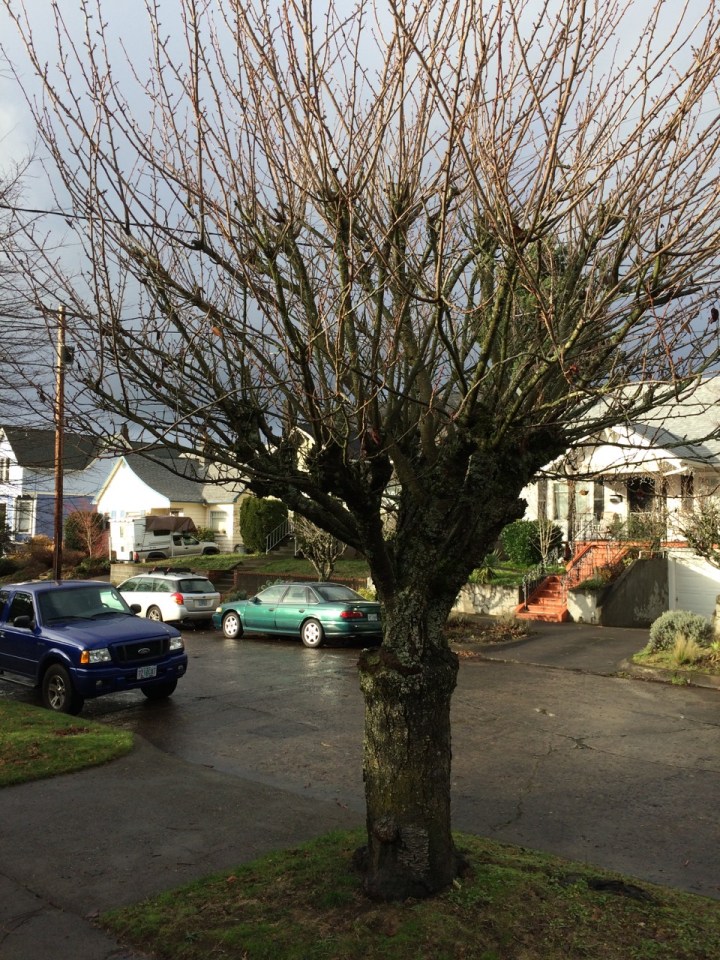 A typical Portland Cherry, Prunus serrulata. There are thousands of these in Portland including the many Kwanzan, Akebono and Fuji Cherries. Other Cherries, like the Yoshino, planted in north Waterfront Park have a similar broad ‘vee’ structure Every branch here has been stubbed off…twice. You can see where each cut has been made with its resultant sprouts, giving it a ‘brush’ appearance. These trees are typically grafted at 4 or more feet above ground. The graft union is prominent at the top of the trunk.