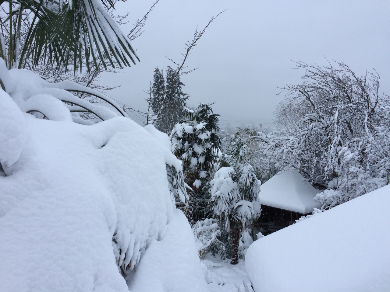 Looking out our bedroom window the morning after at the near Chinese Windmill Palm to the left heavy with snow. Two other palms bend under snow while the neighbor’s Cherry was little effected. Just peaking out in front of it, past the roof, is my very upright growing Cornus kousa, its several competing leaders of which splayed out widely without snapping or splitting.