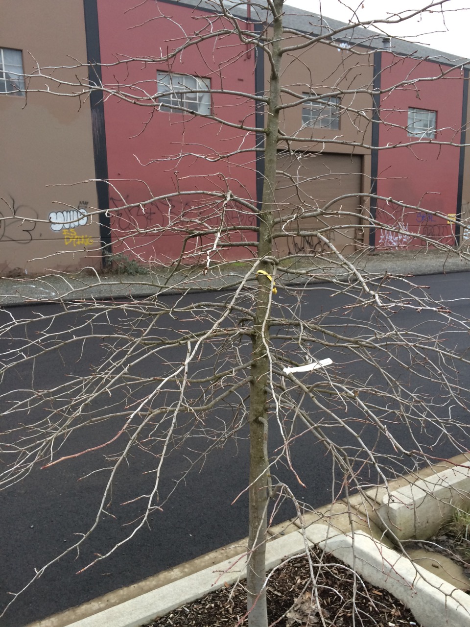 This is young Nyssa sylvatica, often known as Tupelo, planted along Trimet’s new Orange Line, to my thinking, for many reasons an ideal tree here. Normally it grows with a strong central leader, branches with broad angles of attachment that remain relatively small in diameter, is deciduous with strong/flexible wood and is relatively narrow given it’s height. Its beautiful full color, resistance to drought and heavy winter wet soils are a plus.