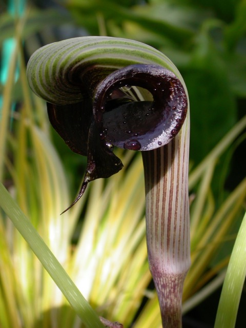Arisaema ringens DSCN2360 ← Previous Next → The spathe structure of Arisaema ringens with its spadix hidden inside beneath its ‘hood’, a member of ‘exceptional’ family of Aroids…still included in the Monocots.