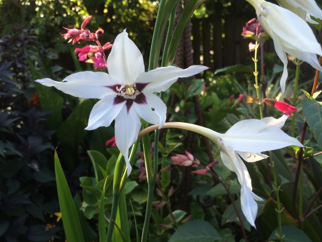 IMG_3051 ← Previous Next → I learned this plant as Acidanthera murielae 30 years ago, though now its known as Gladiolus callianthus ‘Murielae’ has an elegant symmetrical 3-parted flower other than the missing ‘red’ blotch on the ‘upper’ tepal.