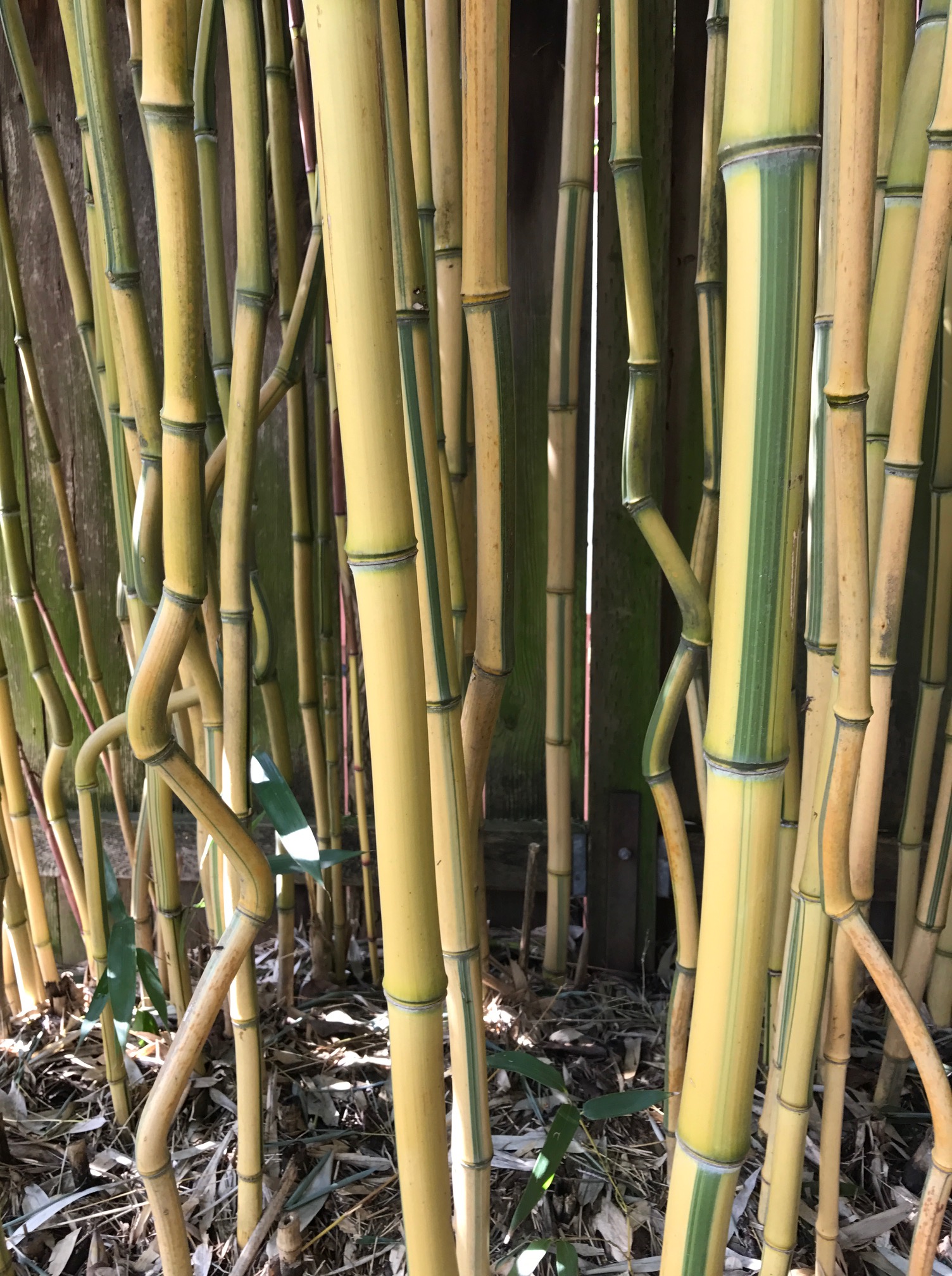 My little stand of Phyllostachys aureosulcata ‘Spectabilis’. Typical of the other ‘crook-stem’ bamboos not all of the culms exhibit this characteristic bending at its nodes. Like all Phyllostachys these form two ‘branches’ at each node, which are often removed to better display the attractive culms.