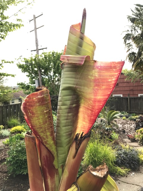 It’s April 29th and my Red Abyssinian Banana has been planted back out for 4 weeks and has made very little growth since, to be expected given our cooler than normal temps, with most days with highs below the mid-50’s. Most warm temperate and sub-tropical plants basically are shutting down below 50ºF. All of the irregular cut tissues were done at one time at the same height. Each emerging leaf is doing so at a different rate, the more fully extended they were at the time of cutting the slower. Each ultimately fans out what’s left of its leaf blade at the same height contributing to the plant’s ‘trunk’ appearance and the uninformed to refer to these as banana ‘trees’.
