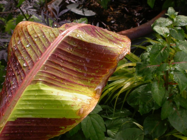 Musa ‘Siam Ruby’ DSCN5291 ← Previous Next → This Banana Siam Ruby, a tender but beautiful form with a lot of red through out the plant. It has the characteristic venation of Bananas each evenly separated from the next extending out to the leaf margin.