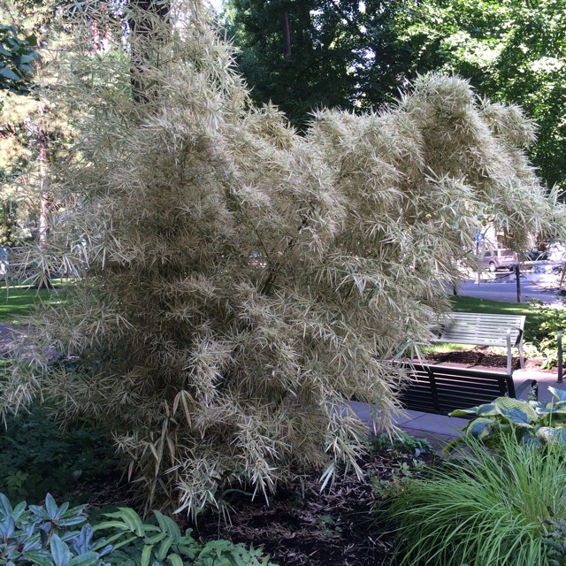 Phyllostachys bambusoides ‘Richard Halbrick’. As a Phyllostachys, you would expect this bamboo to be a runner, but it isn’t very vigorous at all. Part of this may be due to its relatively low amount of chlorophyll in its leaves, as indicated by the large amount of white. This specimen is not contained. It is very demanding of the conditions on its site, loose rich soil, protection from mid-day and afternoon sun and even moisture. This plant is actually in decline. A rescue may be in order, Ian!