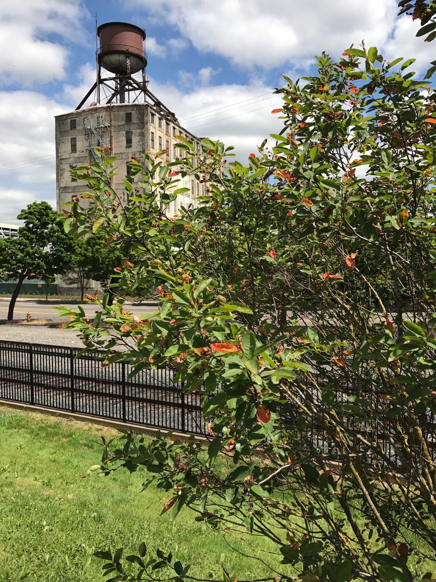 Several larger clumps of Amelanchier alnifolia were planted on the bank and north perimeter of ‘The Fields’. While not disfiguring or as heavy as it could be it is still ‘noticeable’. The fruits seems particularly susceptible to infection. The remaining portion of the old Centennial Mills facility rises in the background on the banks of the Willamette.