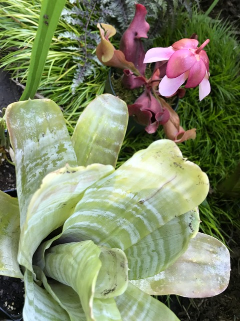 Another Neoregelia, I think, gifted to my by garden blogger Allison in Seattle. Sad to say I let this one get to much intense sun…and it’s not too happy, but I’m trying to grow it out in a more protected spot. That’s a flower from one of my Sarracenia top right.