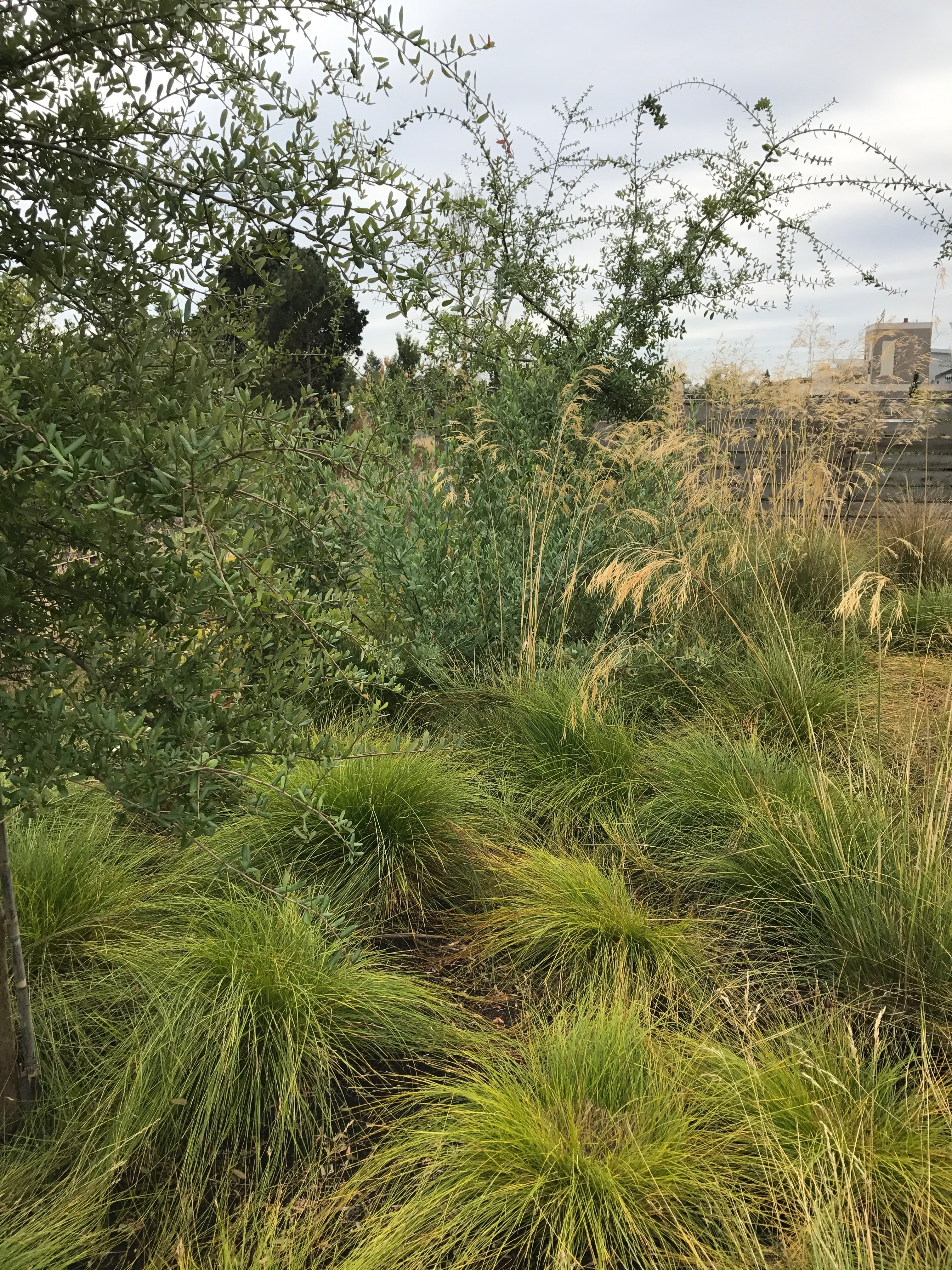 This first group of photos come from some of the perimeter beds. Olives, Romneya, Carex…with the deciduous punctuation points provided by the tall arcing culms and ‘flowers’ of the deciduous Stipa gigantea. From my experience, due to the extent of weed ‘penetration’ in our modern landscapes it is difficult to have a successful one that is primarily deciduous…even though those of the historic past were….We have to remember that the ‘weed pressure’ on our original landscape was essentially non-existent.