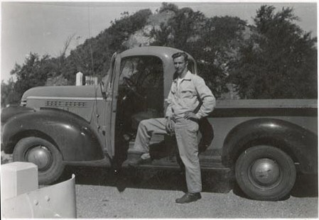 Wright_Art_FirstTruck ← Previous Next → Dad with his first truck, probably in California, with chaparral in the background