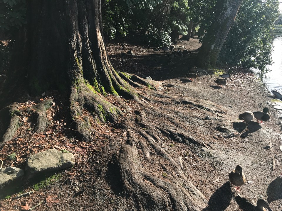 This Metasequoia, @30″ dbh, at Crystal Springs Rhododendron Garden has this broad ‘flare’ or mantle of roots giving the tree a rigid wide base, much wider than its trunk width, adding considerably to its stability. This trait developed early in primitive trees, that like this one, grew on swampy, wet sites. Other species like Cupressus decurrens and Ficus microhylla have an even more exaggerated mantle.