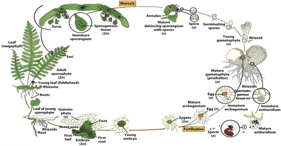 This is the life cycle of Pteridophytes, vascular, non-flowering, non-seed producing plants. Their life cycle is very similar to the more primitive, non-vascular bryophytes, the mosses, liverworts, etc…with two primary differences: the Bryophytes dominant, photosynthetic stage is their haploid, gametophyte stage producing separate male and female gametophytes which then produce the sperm and egg cells which upon fertilization produce the diploid sporophyte. In Pteridophytes, ferns, the diploid sporophyte is the dominant form we recognize and the gametophyte is dioecious containing both sexes, producing both eggs and sperm from different organs.