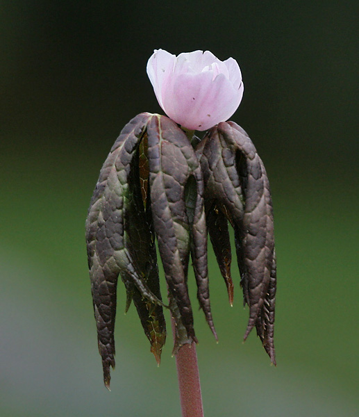 Podophyllum_hexandrum_W_IMG_7315 ← Previous Next → This picture shows this species, unique for it, flowering structure, blooming singly, upright and above the leaves. Here we see the early bloom open before the leaves have fully expanded shortly after having emerged in early Spring.