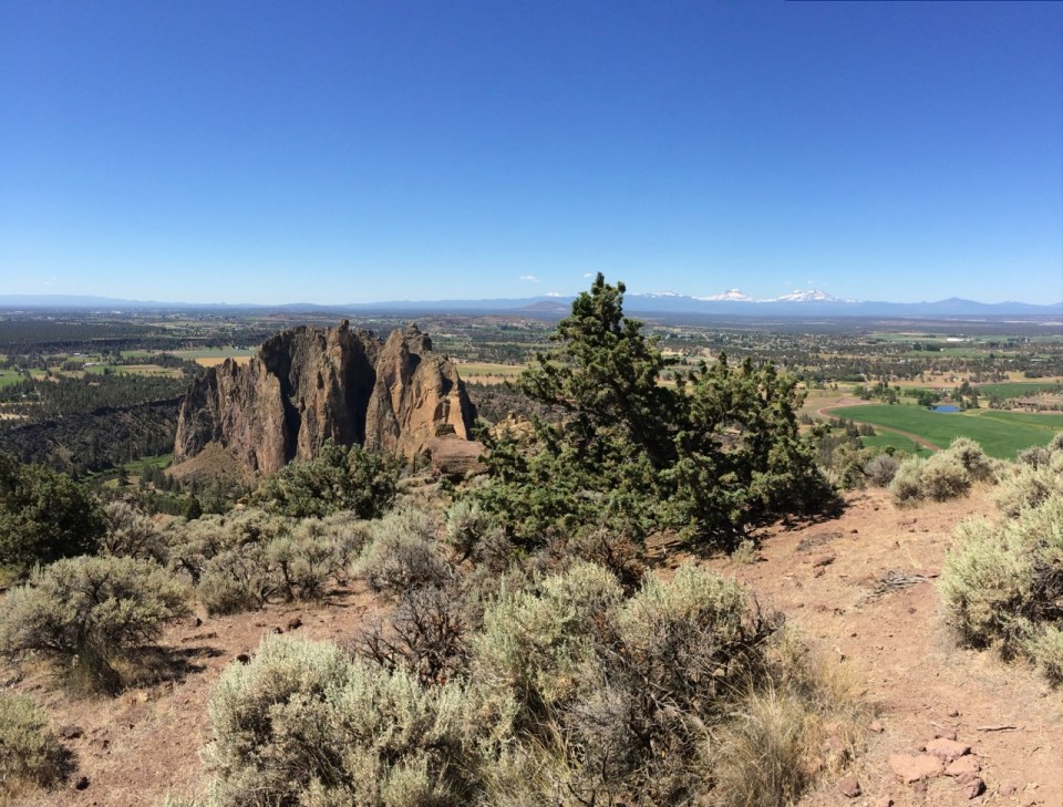 In the comics world this would be called my ‘splash page’, a picture related to but not exactly honest, done for effect. This is taken from the top of the popular destination Smith Rocks, on top of Misery ridge, the trails up and down of which have been the cause behind many an emergency run to the local hospital. Here we’re looking across irrigated pasture lands in the middle distance, that would be steppe if not for all of the added water and on to the Cascades along the horizon.