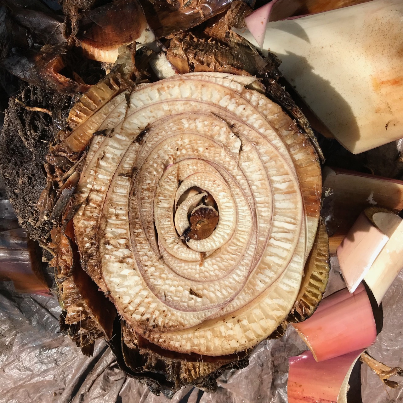 IMG_0505 ← Previous Next → This cross-section shows the relatively healthy leaf tissue, still connected to the otherwise health and life giving rhizome surrounding the central rotting spear of the now unsupported newest growth.