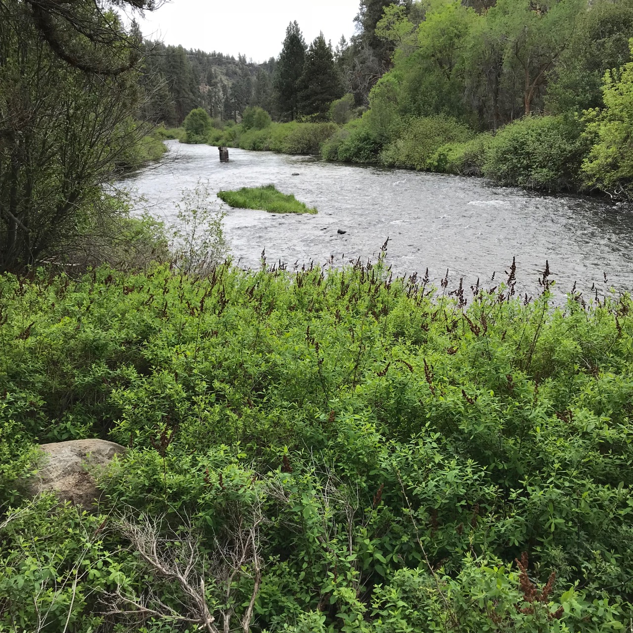 IMG_0758 ← Previous Next → Near Tumalo State Park looking upstream across the thicket of growth that closely borders much of the river, here it is Spiraea douglasii. An abandoned bridge pier remains midstream in the distance.
