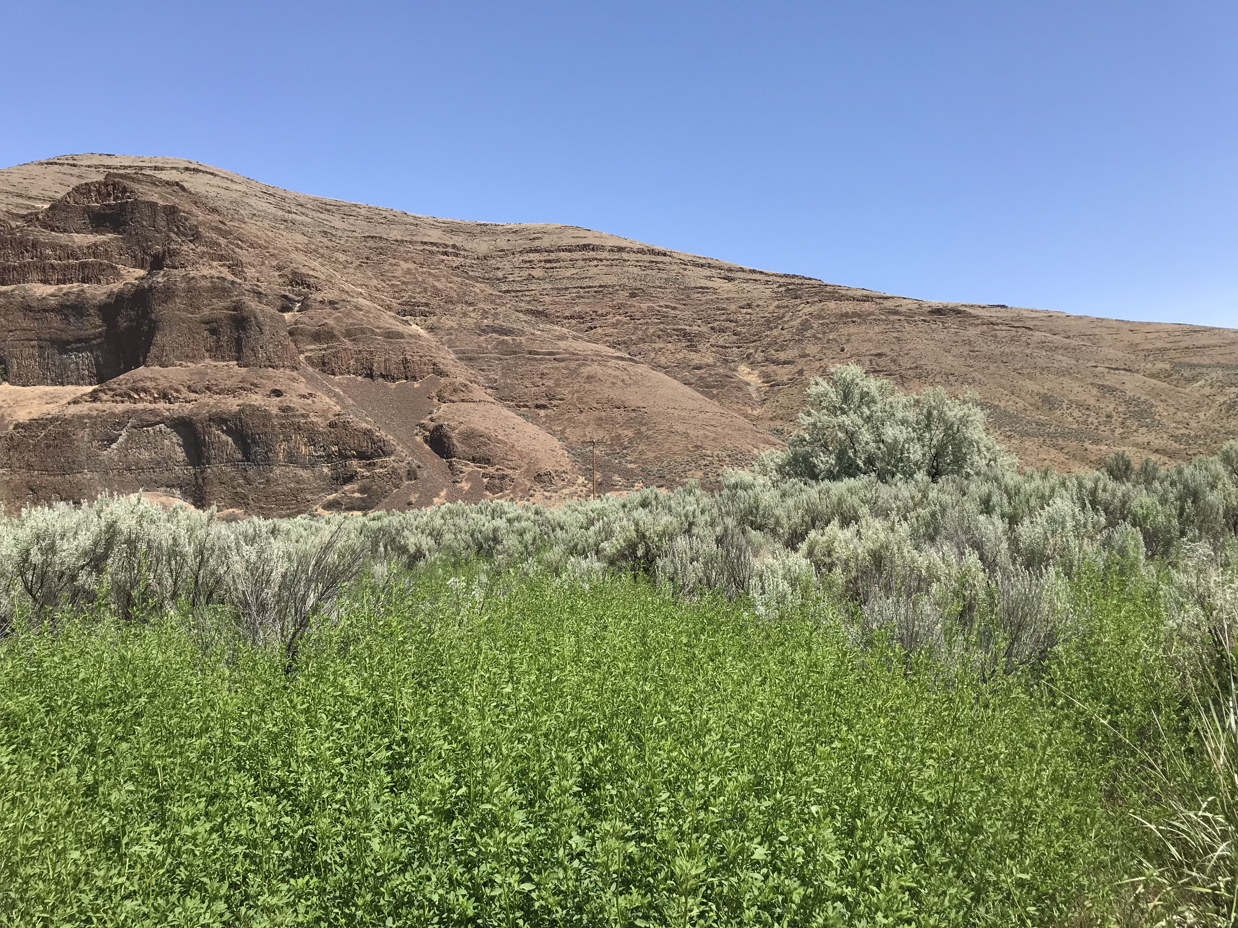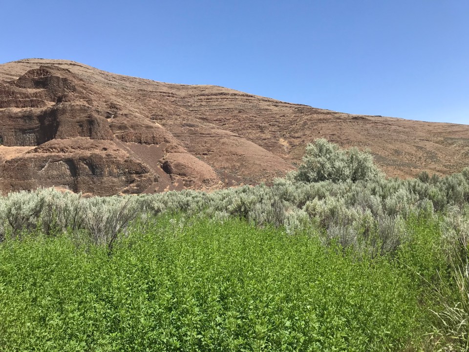 IMG_1042 ← Previous Next → A lone Russian Olive, Elaegnus, stands alone this side of the river channel is a sea of Sagebrush. Occasionally we came across these patches of Alfalfa, remnants of the ranch?