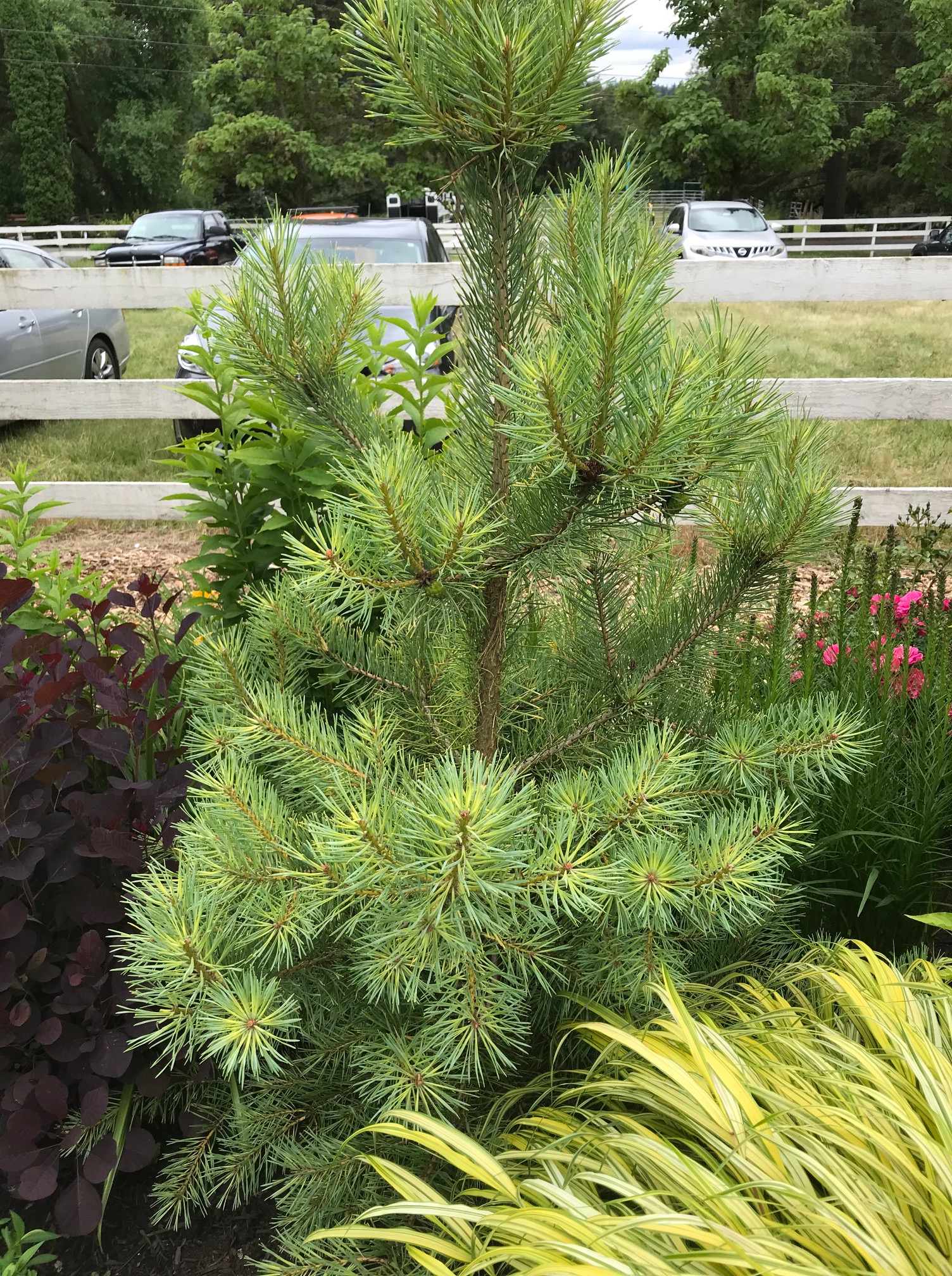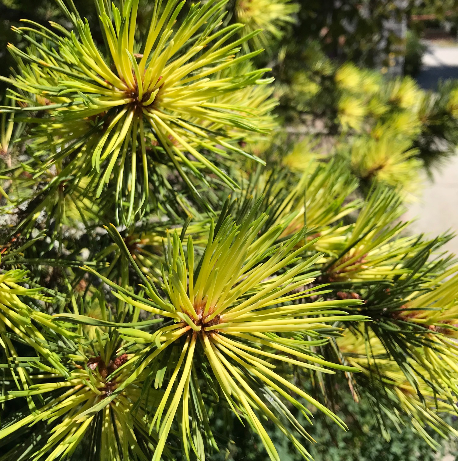 This Cupressus arizonica var. glabra ‘Sulphurea’ echoes the same colors as the Pines shown here, again in Camille’s garden…in a very different textural ‘package’! It has very different soil and water requirements, that have thus far caused me to hesitate before buying it. Previously I’ve tried a few other Cupressus cultivars that in my rich soil has grown too quickly, requiring excessive bracing and toppled, or threatened to do so where I planted it in my xeric bed. I still love this tree.