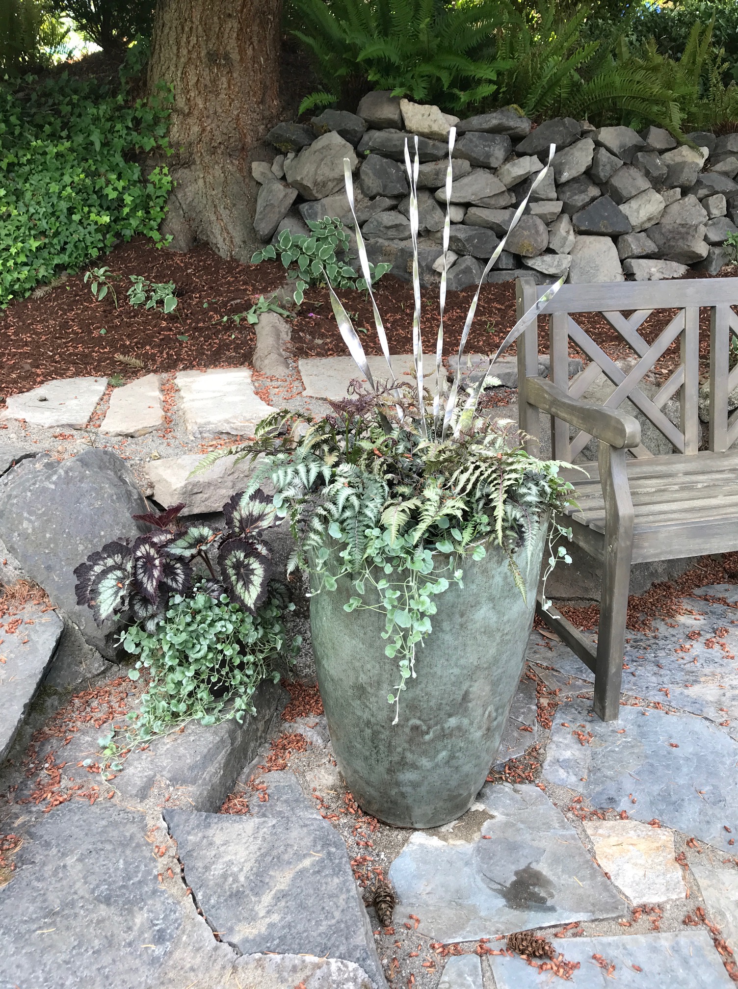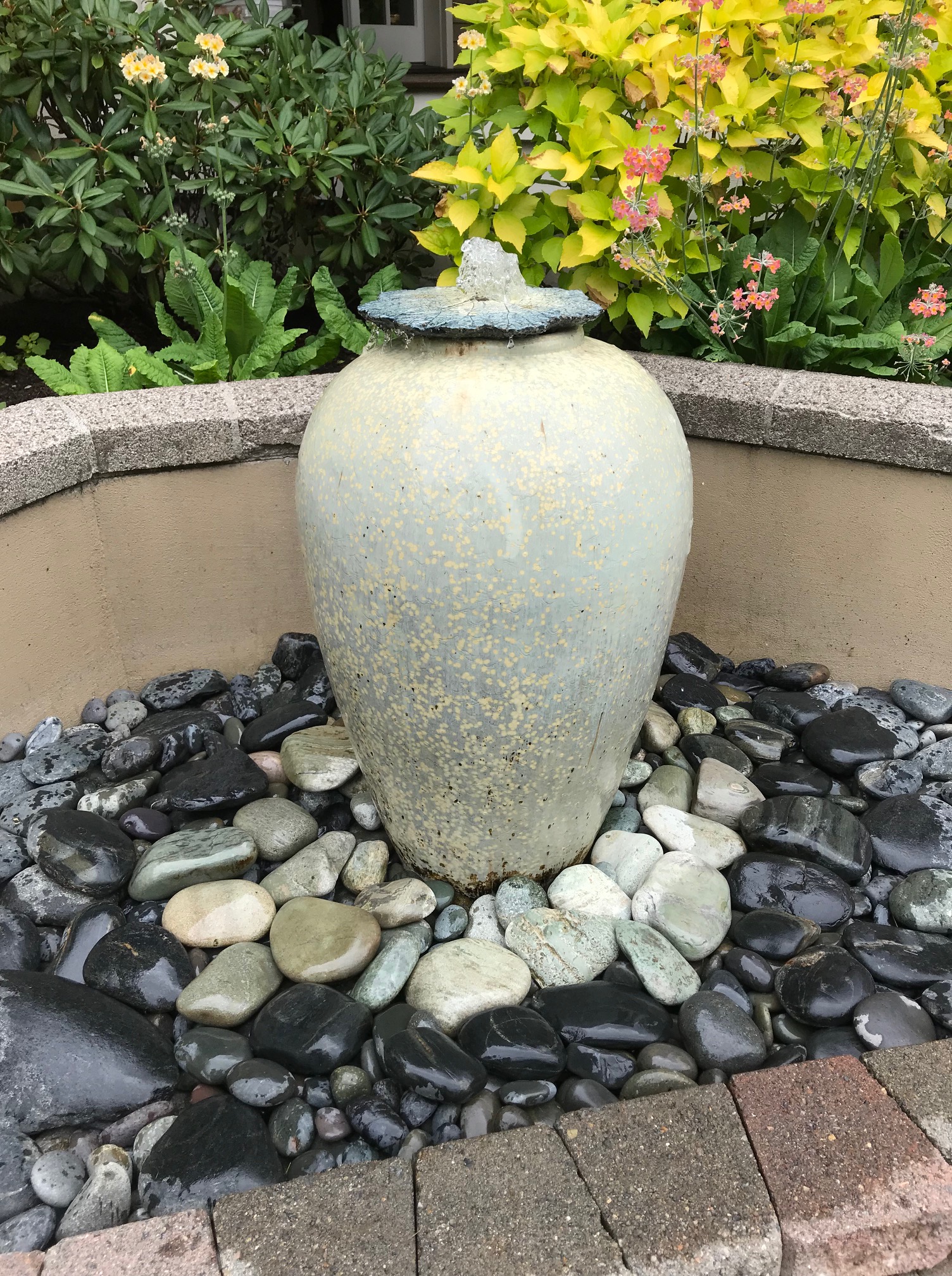 Another well executed fountain, this one below his large Tree Fern he takes pride in and protects every winter.