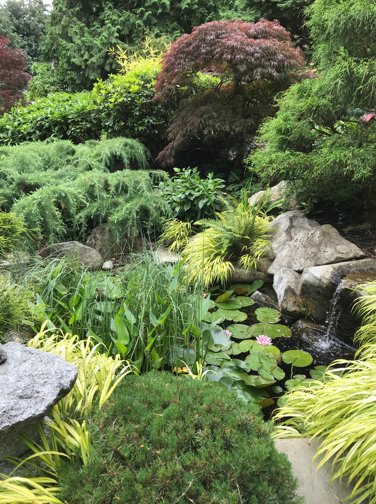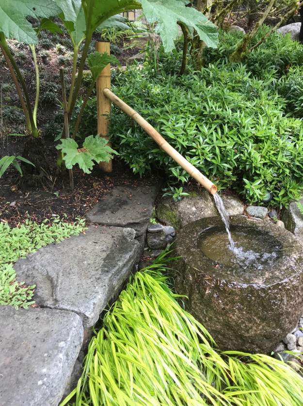 The last garden we visited on Monday, belonged to Camille. It may have been our all around favorite on its hillside location above the Orting Valley with views, across…of thick clouds, its flowing design, well built and appropriate structures, ‘Best Tori Gate’ and an eye for plants that sated my own desire for the unusual with enough discipline to pull all of its parts together. I ended up taking more pictures in this garden, partially because it seemed less crowded with visitors, I’m sure because it was on Monday and all of the way it in Puyallup!