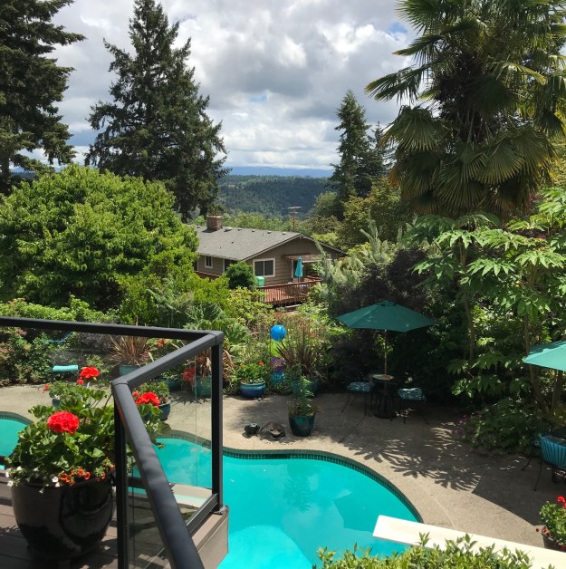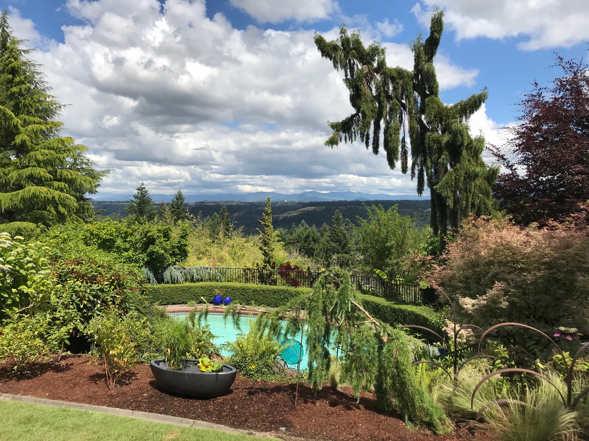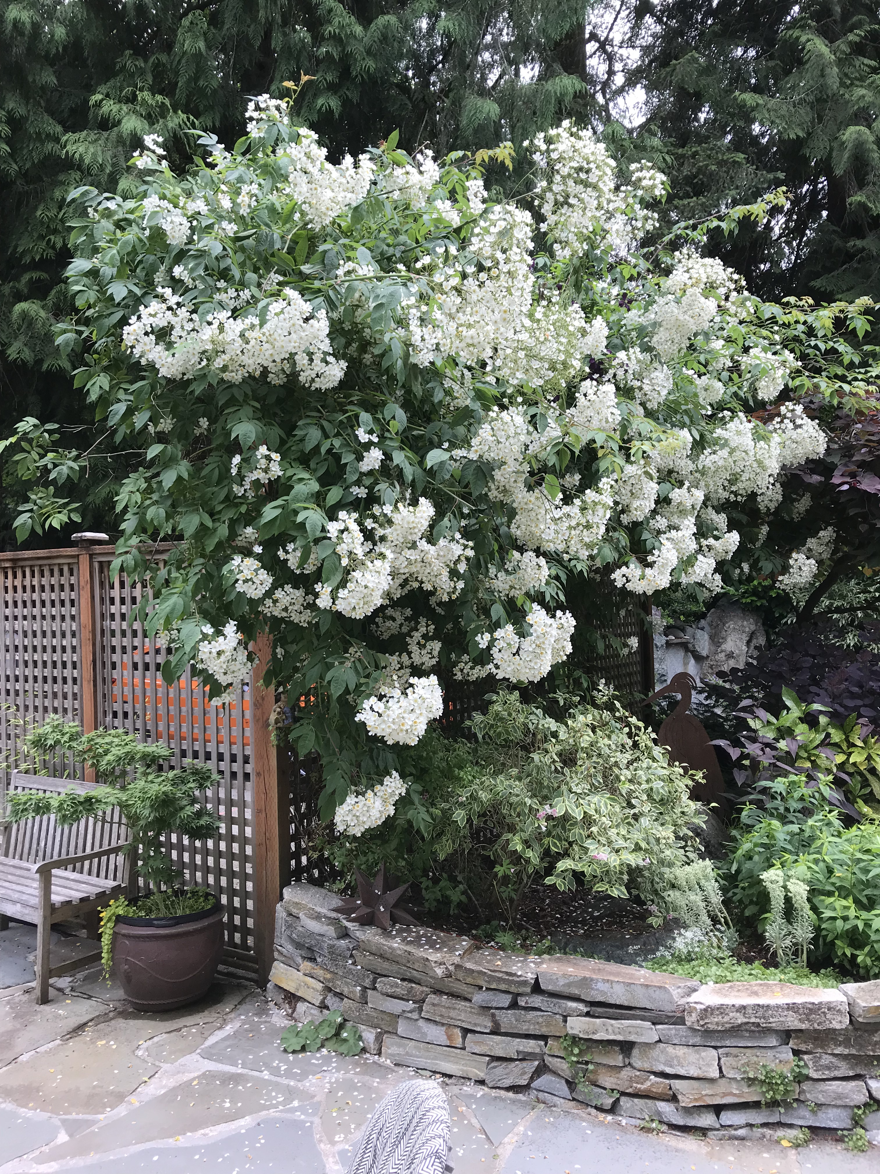 Thank you Julia for your hillside garden, for offering us perhaps the best obscured view on the tour of Mt. Rainer, for your still blooming Calycanthus chinensis and its gorgeous white flowers. I couldn’t find my picture of it, as I’d saved it somewhere! but found it and posted i later. Thanks for your graciousness and the gift of an individual serving size cup of Costco guacamole that saved us from our plain chips. A mature garden doesn’t mean boring.