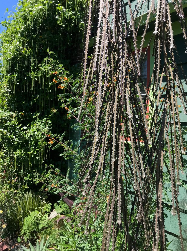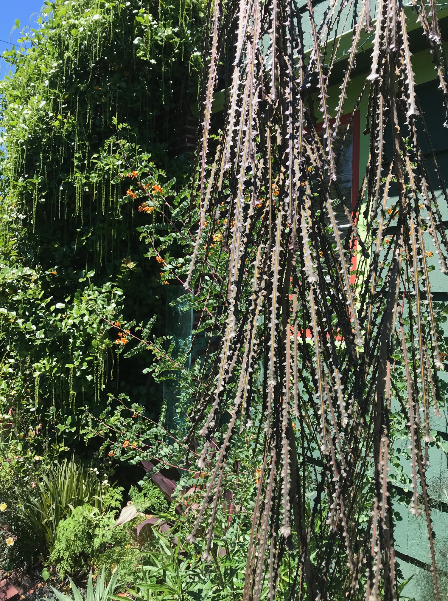 The Aralia family provided a lot of stars in the Weekends gardens, including this Pseudopanax ferox, zn 8b, Paul Smith moved to this garden. I saw P. crassifolius in another garden with a very similar look. I didn’t see any Arailia echinocaulis that jimi Blake is so enamored with, a Dr. Seussian plant with an entirely different form. And do you see the Itea chinensis trained up the south facing chimney? Gorgeous!