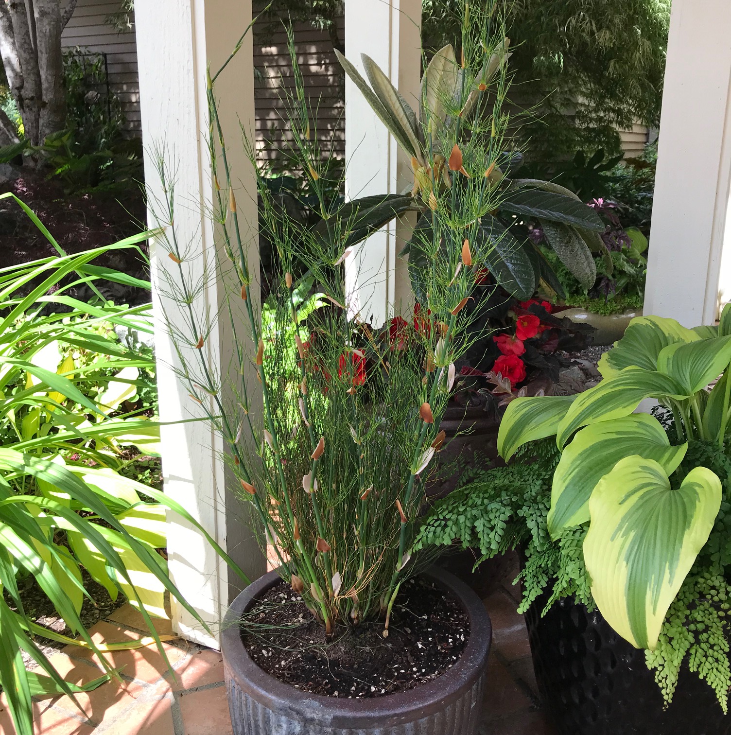 I love the Restios as a group. This one, Elegia capensis, has gorgeous bracts and as a zn9b plant this pot shows it off well and makes it easy to move inside to protect.