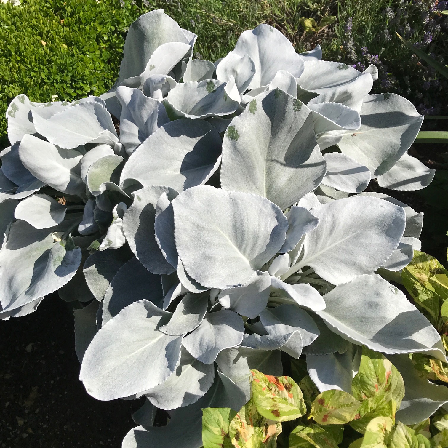 In Lisa Bauer’s front garden, Senecio candicans ‘Angel Wings’ one of the weekend’s stars of many pot vignettes, said to be of unknown hardiness for the wet PNW, but but gorgeous with its somewhat succulent leaves.