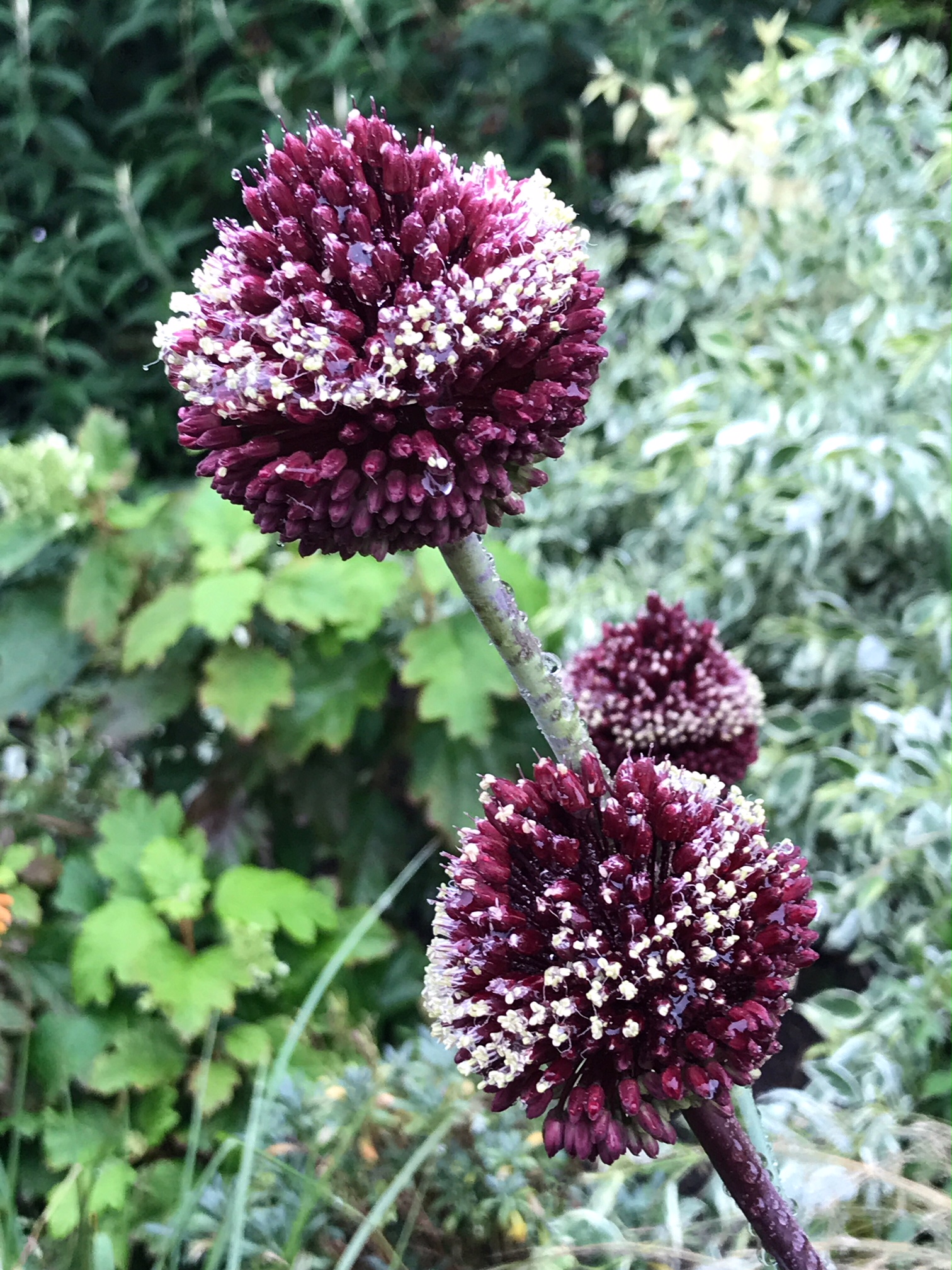 This was the only photo I took at Mcmenamin’s Anderson School in the steady drizzle. Several in the group were struck by this plant, Allium ‘Red Mohican’. There were many remarkable plants here including a Chain Fern, Woodwardia unigemmata, with 4′ fronds leaning over a low planter wall, which I saw later growing at Old Goat Farm, which prompted me to go home, dig mine up to put in a pot, saving it from where it was struggling in the roots of my neighbor’s Kwanzan Cherry! The many, very different gardens at Anderson are especially impressive in their design and size when you consider that it is only Riz and his assistant, Michelle, who are the sole worker bees there.