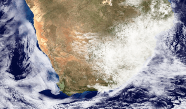 This satellite shot shows how the trade winds tend to bring ocean moisture to South Africa from the east moving westerly leaving the Region wetter in the east and drier in the west, which has a summer/dry, winter/wet climate much like the west coasts of the major continents around the world.