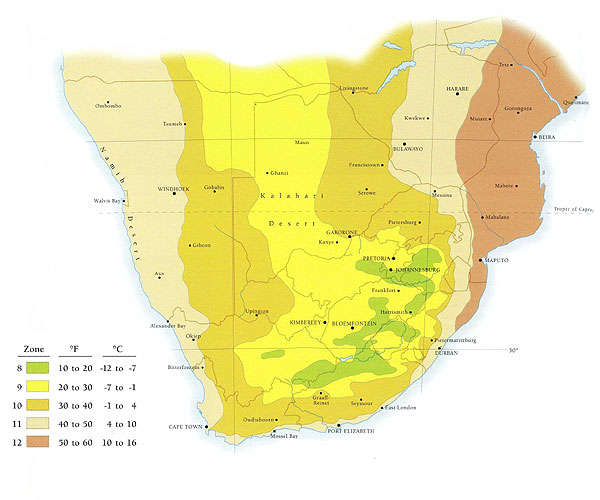 This map reflects the USDA designated growing zones applied to South Africa. As with any such map this cannot show every cold spot as these vary widely with the land forms. The warmer east coast temperatures are reflective of the warmer Indian Ocean, while the cooler and drier west coast results in large part to the wind patterns coming off of the colder ocean to the south which carries less water vapor. The colder temps in the middle are reflective of their position at some remove from the Oceans and their overall higher elevations. Recall that the High Veld sits atop the plateau of the Great Escarpment which was once capped with many feet of basalt, most of which has eroded away.