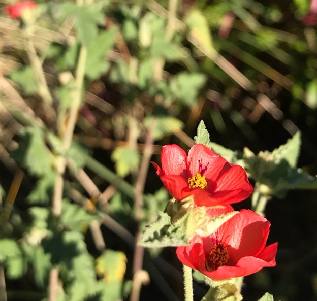Sphaeralcea ambigua, one of the largest growing species of the genus, at up to 3′-5′, often found considerably smaller, is native to the US Southwest, SW Utah, Nevada to Arizona and southern California down to Sonora and northern Baja, Mexico.  They are found east of California’s Sierra Nevada and the several other smaller ranges of southern California, which shield them from moisture coming from the Pacific.  It is the most xeriphytic of the genus, meaning, the most tolerant of drought.  The USDA breaks the species into four separate subspecies, S.a. ssp. ambigua, the most commonly occurring form across the four states with the typical orangey flowers, S.a. ssp. monticola, the one occurring at higher elevations, beyond the Sonoran Desert and covering its Nevada range, S.a. ssp. rosacea which is limited to the San Diego area east to Maricopa county in Arizona, of the warmer Sonoran Desert, with a flower that is rosy-pink and S.a. ssp. rugosa which is limited to the Mojave Desert area with the more expected orange-red flowers.  Both S.a. ssp. ambigua and S.a. ssp. monticola grow on north of the Mogollon Rim, an east-west running escarpment,  the abrupt rise in elevation marking the southern edge of the Colorado Plateau.  The other two subspecies grow below this and largely south and west of it.