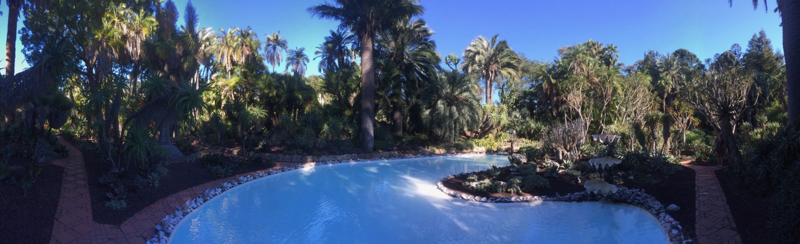 Afternoon sun in the beautiful garden of Lotusland in the mild coastal climate of Santa Barbara, here amidst multiple Palms and Tree Aloes. This is one of those relatively few areas in the US where such plants as those that come from the Canary Islands, South Africa and Australia can grow outside.