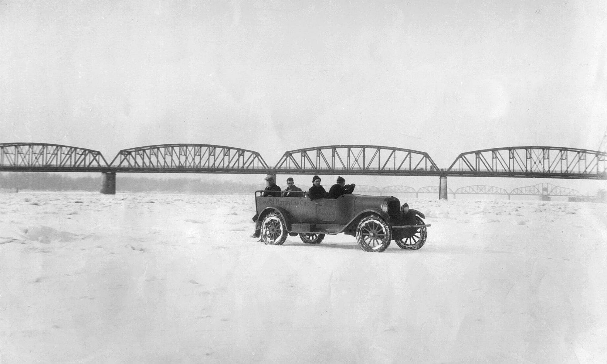 A print from the archives of The Columbian showing a car driving across the Columbia. It used to get very cold and stay that way. This combined with the absence of the dams changed flow rates and temperatures enough to allow freezing. It appears to be the railroad bridge in the background looking east with the Interstate in the distance beyond it.