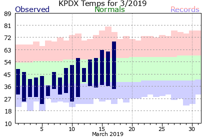 This chart for March again shows the slowly warming/rising light green normal band contrasting with the dark blue bars of our actual temps. The March temps appear colder because they shifted the chart downward. The more extreme minimum temperature swings of Nov., Dec., and Jan. have even out, the lt. blue portion narrowing and showing more consistency.