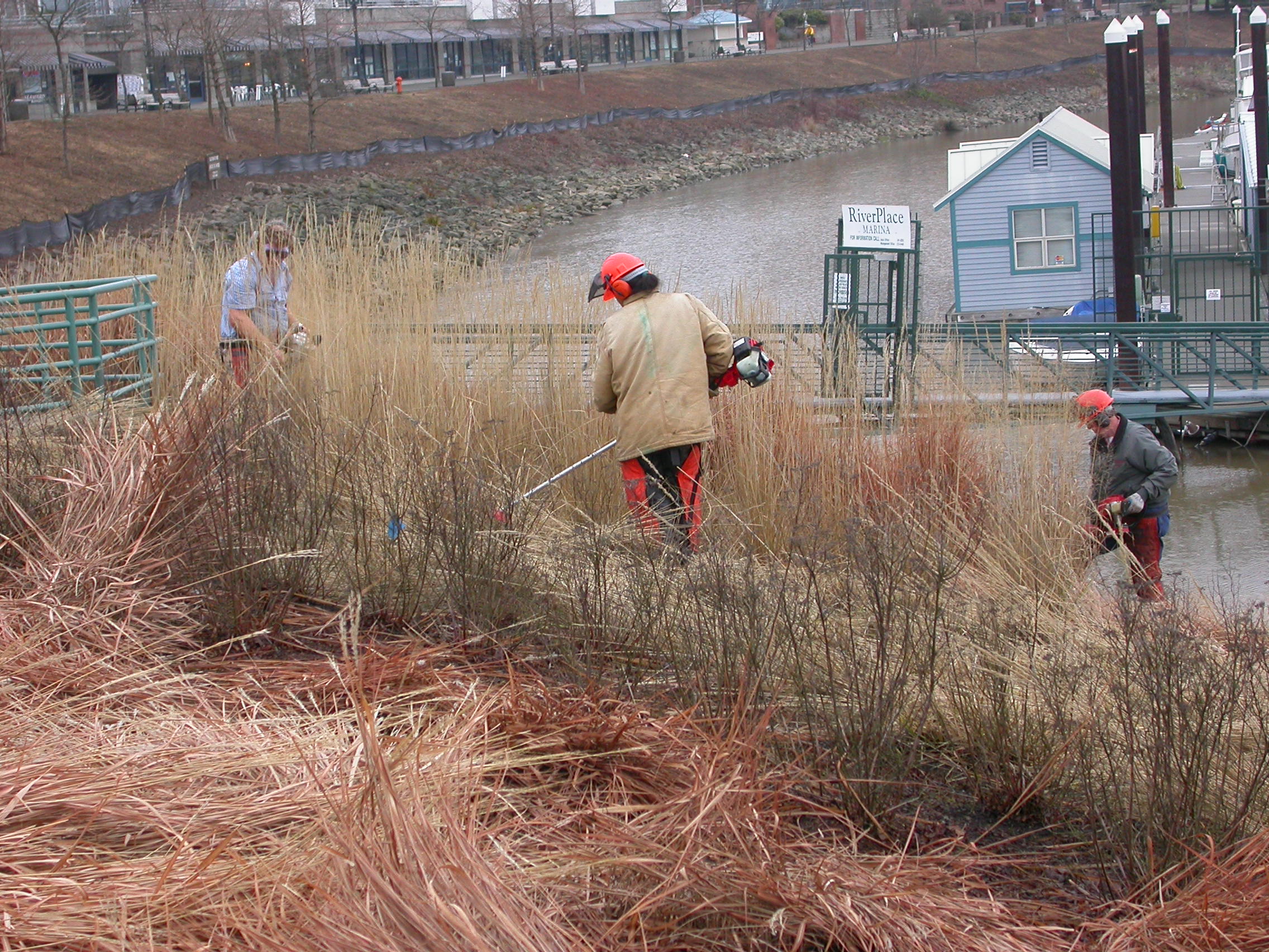 The near acre of ornamental grasses along the Willamette in South Waterfront Park are cut and removed late each winter before spring growth initiates. Because this was planted with ornamental bunch grasses this site is very problematic for weed control with bare soil between each plant. In the distance you see the strip that was being prepped for replanting in ’03, its mature mat of English Ivy removed. This site was planted with another acre of large sweeps of individual plants and again, continues to be very maintenance intensive. With tightening budgets and staff reductions these areas have become more seriously degraded by invading weeds.