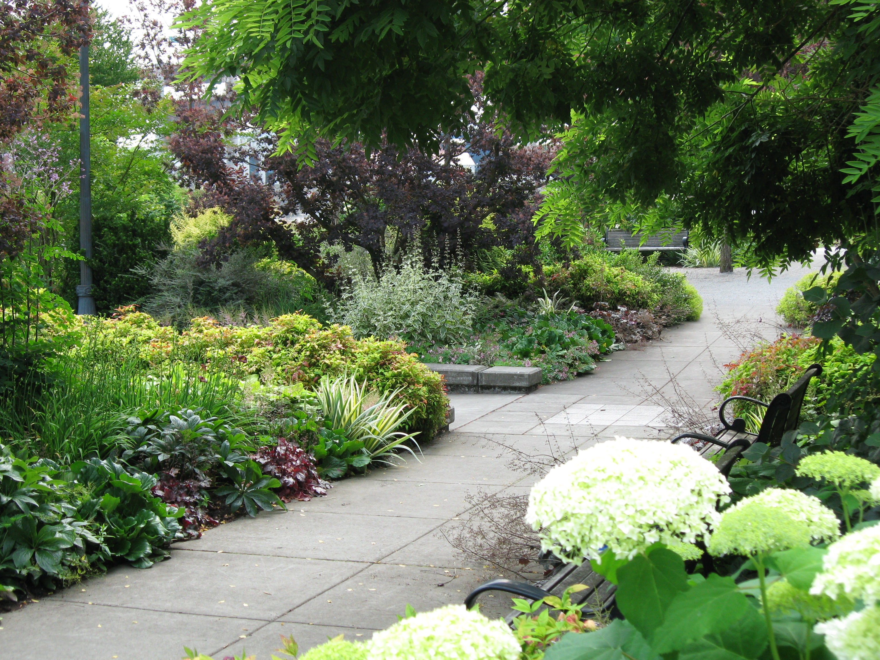 Elsewhere in the garden at South Waterfront, these beds originally included Anemone hupehensis ‘September Charm’ which is an aggressive spreader and mat former. It took several years to eventually rid them of this plant which quickly threatened to dominate the area choking out the more ‘docile’. These too have received regular ‘editing’ to keep the plants in balance. There was an attempt in the design to create a matrix planting, but the plants chosen did not form a natural community and were a volatile mix. We have to work to create beds that live in relationship with. The giant inflorescences of Hydrangea arborescens ‘Annabelle’ hover in the foreground.