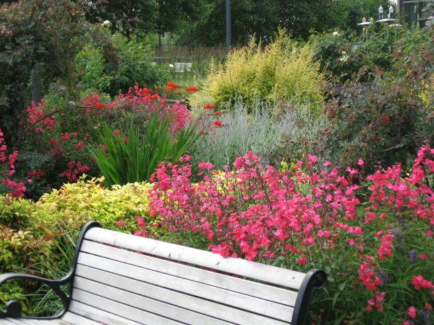 These beds are in South Waterfront Garden including Penstemon ‘Ruby’, Crocosmia ‘Lucifer’, Rosa glauca, Perovskia atriplicifolia and Lonicera ‘Baggesen’s Gold’ and like any perennial garden it requires regular monitoring, weeding and, for some plants, deadheading. Over the years I cared for this garden its composition changed as I sought a balance between beauty and economy.