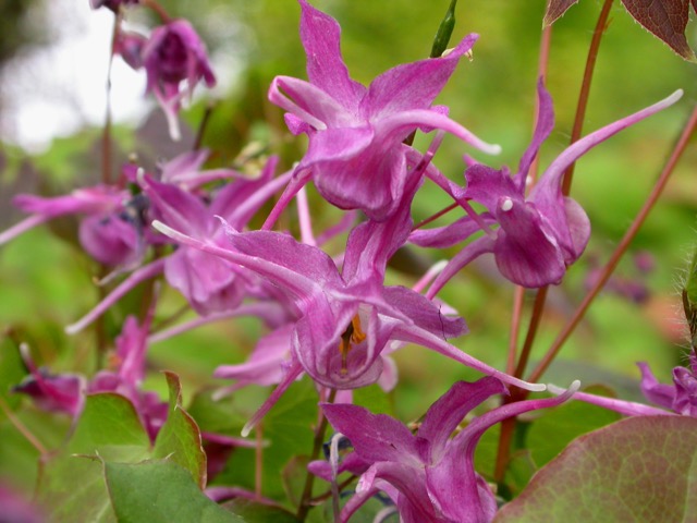 Epimedium grandiflorum ‘Lilafee’ is a member of the Barberry family and order Ranunculalaes which form one of their own branches within the assortment of genera called Basal Eudicots. Such plants can exhibit ‘ancestral lineages’ and not fit strictly within the Crown Eudicots. So the Epimedium, Berberis and Mahonia among other genera including the more distant related Buttercups share the triclopinate pollen, but are somewhat removed from Eudicots. These have 4-parted flowers, sepals, petals and stamen.