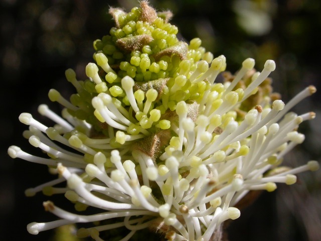 Fothergilla major inflorescence DSCN0443 ← Previous Next → Fothergill major, a member of the Hamamelis family, or Witch Hazels, within the order Saxifragalaes…yet another exceptional group on a level of the Rosids. The flowers form on a spike, apetalous, with prominent white stamen.