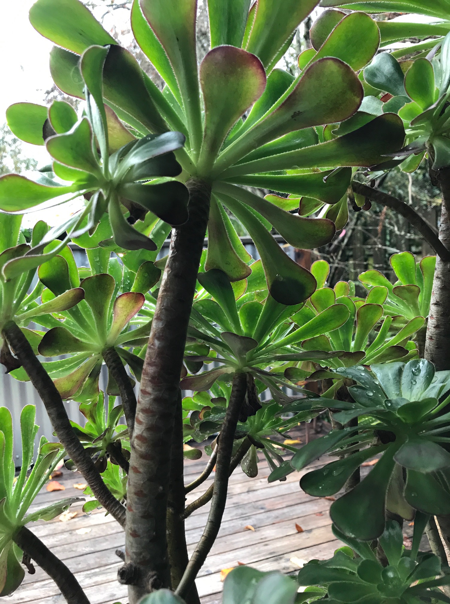 Aeonium. This is a member of the Crassulaceaceae, a family of succulents that all utilize the CAM Photosynthetic pathway, the most historically recent variation in photosynthesis. CAM is believed to have independently developed many times through convergence. It is not tied to a particular monophyletic line. CAM and an Aeonium’s capacity to store water were both adaptations to a more arid environment, one that did not exist in earth’s earliest history. While this makes it a more recent development the morphology of the plant mimics more primitive structures, like its petiole-less leaves that attach directly to the stem leaving a scar where they had been attached and a stem structure more characteristic of some of the most primitive ‘trees’. But these aren’t among the most primitive plants. Botanist tend to assign the family to a date between ~100-70 Ma. These are a striking ‘product’ of the modification of genes that still meet the modern requirements of a plant in a changed world.