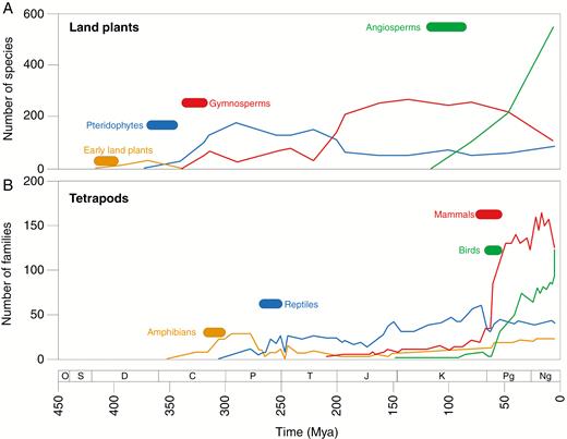 m_mcx10901 ← Previous Next → Sometimes graphs are helpful. In this posting I am primarily addressing Angiosperms. This chart shows the major plant and animal groups over the last 400+ million years, mammals and angiosperms being the new kids of the block.