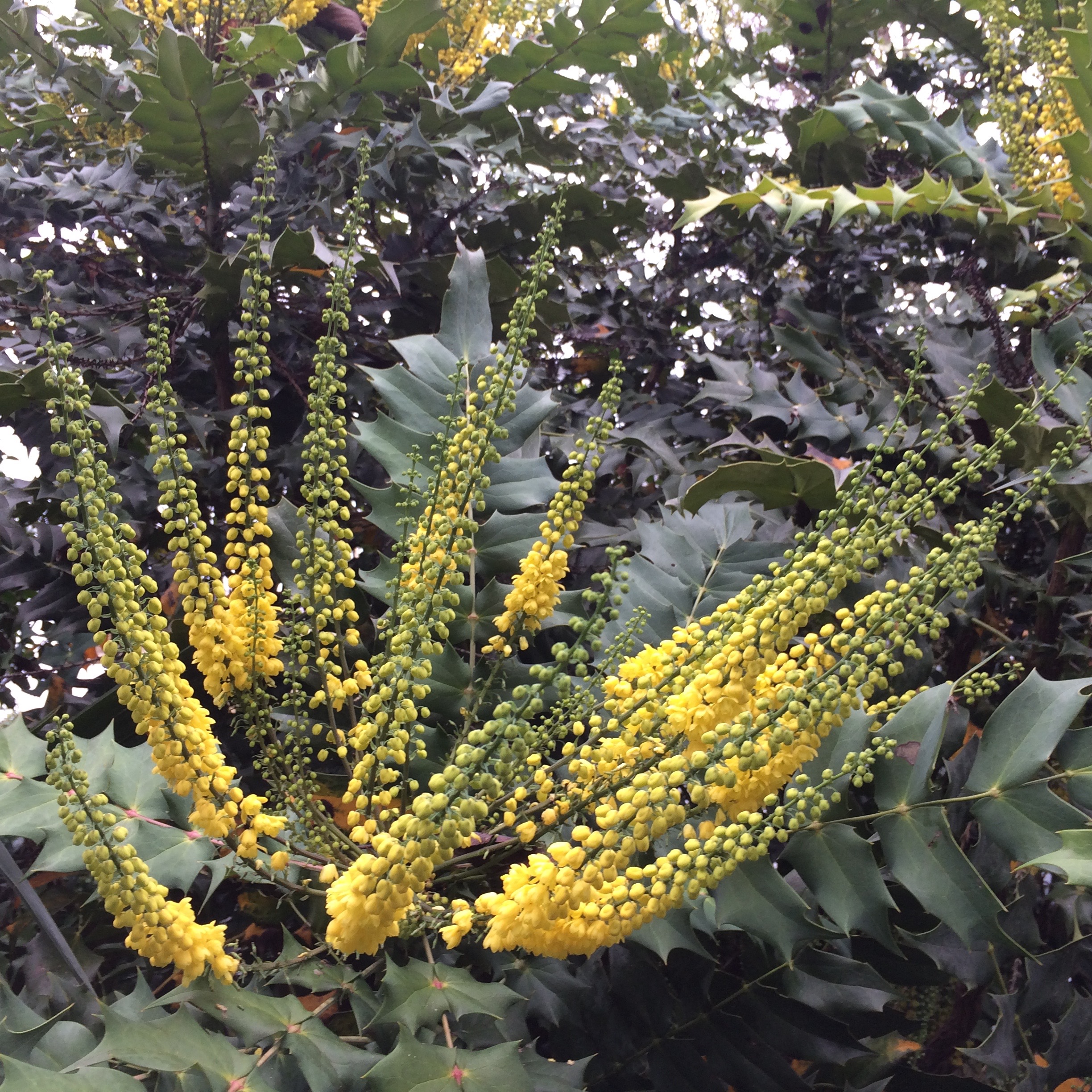 Mahonia x media ‘Arthur Menzies’ . An Asian relative of our common Oregon Grape, this one a boon to our native Annas Hummingbirds when it blooms in winter. Berberidaceae Ranunculales Eudicots