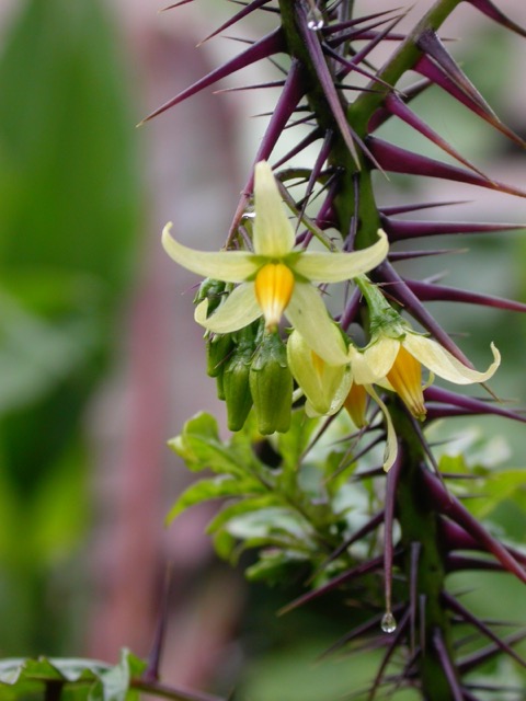 Solanum purpurea Malevolence DSCN2239 ← Previous Next → Solanum purpurea ‘Malevolence’ has the 5 petaled Eudicot pattern. A member of family Solanaceae, order Solanales and an Asterid.